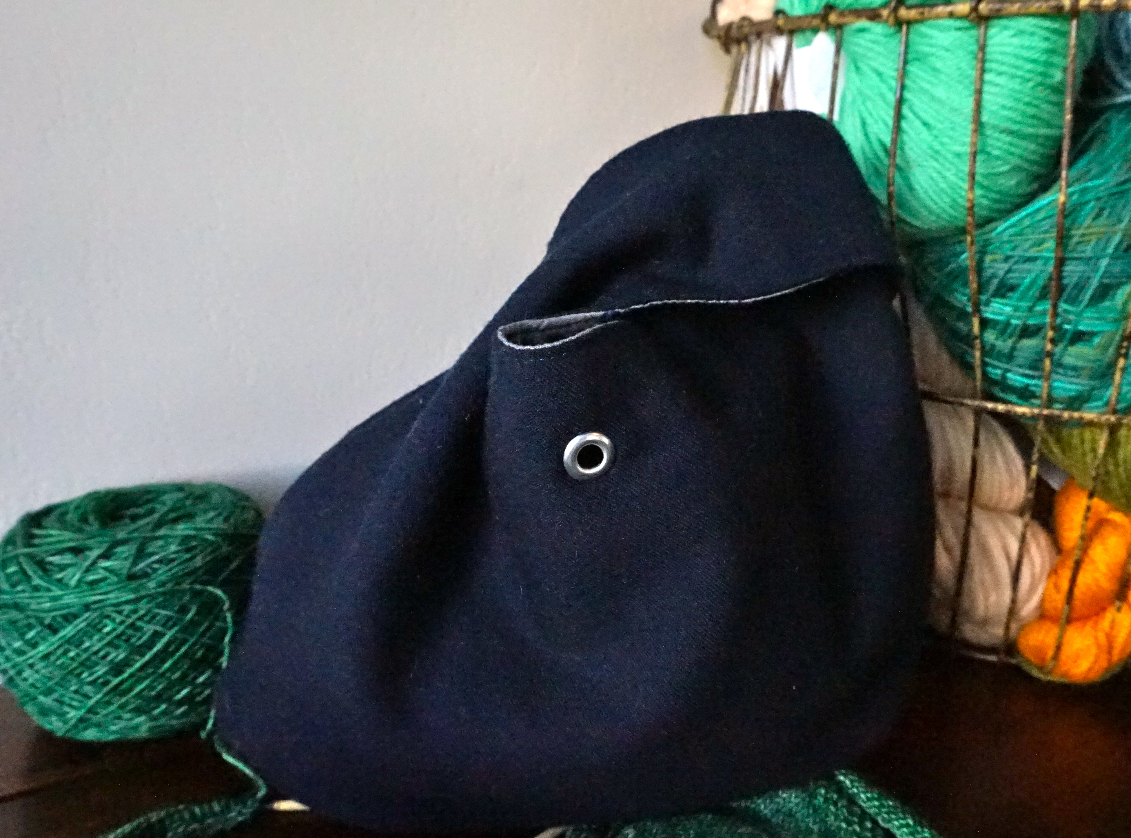 I was playing around with adding pockets, and I added this pleated pocket which is rounded at the bottom. I also used a grommet above it to either use for yarn to go through or earphones (the device then can sit in the pocket). I like it because if I’m sitting on public transit, my earphones won’t get in the way of the knitting project on my lap.