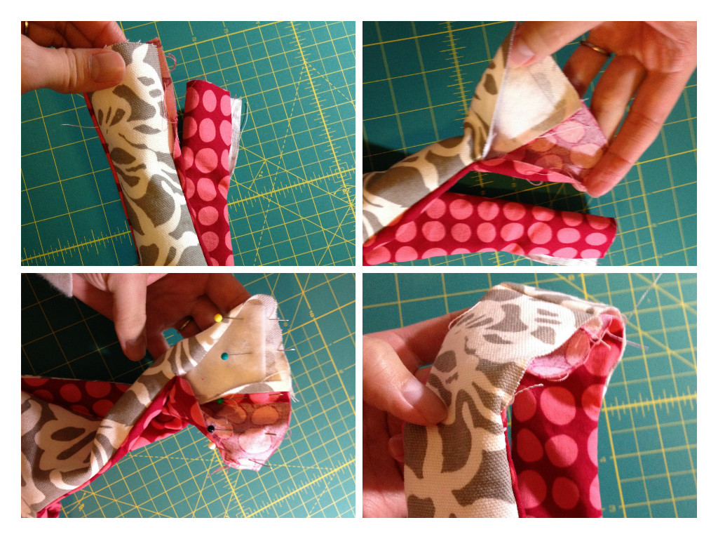 Instead of leaving the entire tops of the straps unstitched when sewing right sides together, I found it easiest to sew all the way to the top of one side of each strap. On the opposite side of that strap, I would leave a 3″ opening. I did this to each strap, leaving the 3″ opening on the inside of each strap (inside referring to the inside of the bag). Then when I flipped the bag right side out as in the first picture in the collage, I opened up each strap, placed them right sides together as in the second picture, pinned, and sewed them using a 1/2″ seam allowance. I pressed the seam open and trimmed where it was bulky, then when turned right side out, there is only one seam on each strap to sew shut by tucking in the raw edges and top stitching. Hope that makes sense! It really simplifies the sewing the straps. My first attempt following the pattern’s instructions left me hand basting to keep the seams laying flat to topstitch. What a pain!