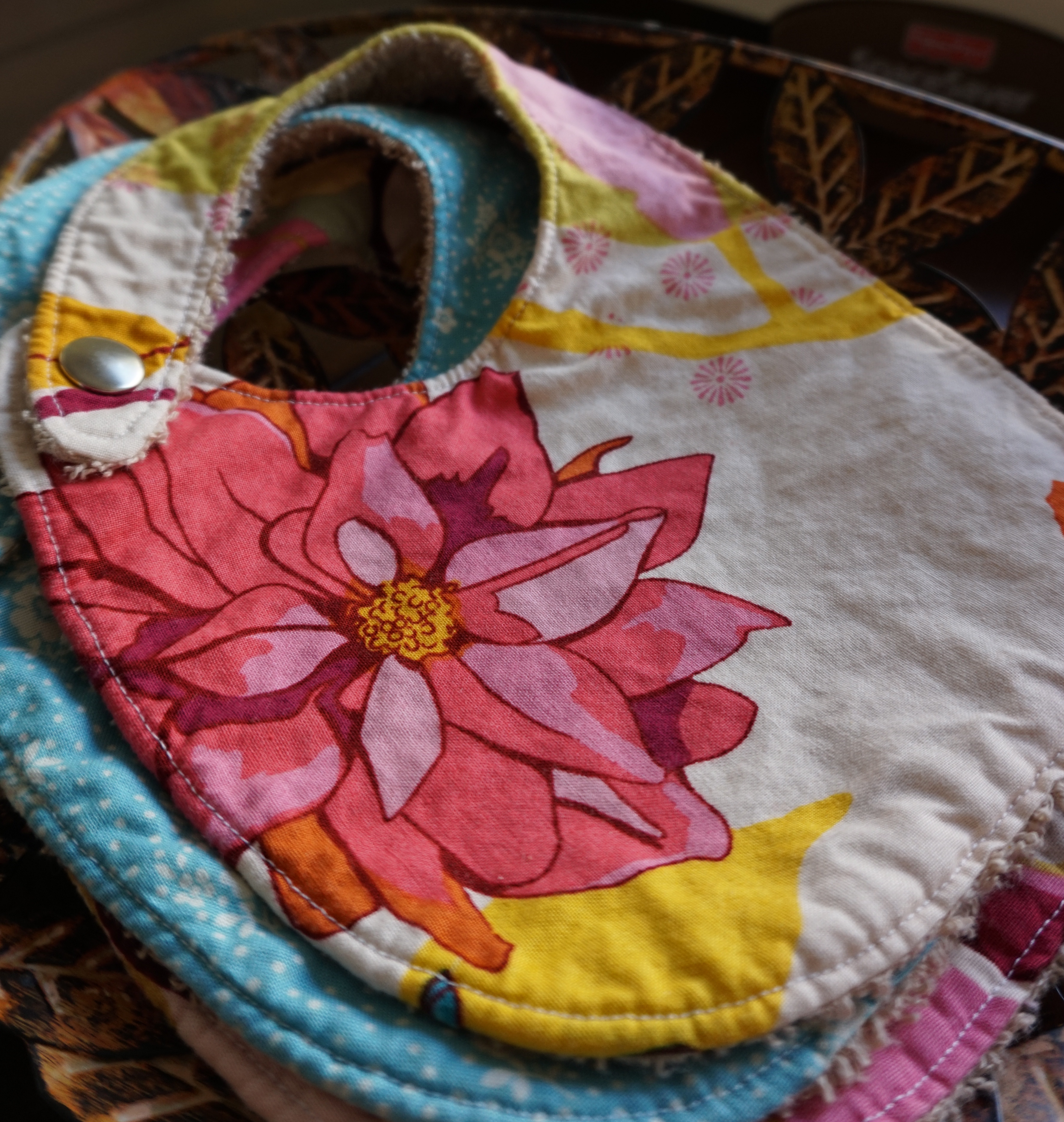 A couple of weeks ago I whipped up 5 new bibs. I love this project because they use up the larger scraps (by larger I mean larger than a quilting scrap, smaller than a fat quarter) I have taking up space. I have a few scrapbuster projects I love to make that uses up these weird sizes, all of which I’ll share at some point, but it’s nice to use some of my favorite scraps in a way that I’ll get to look at all the time!