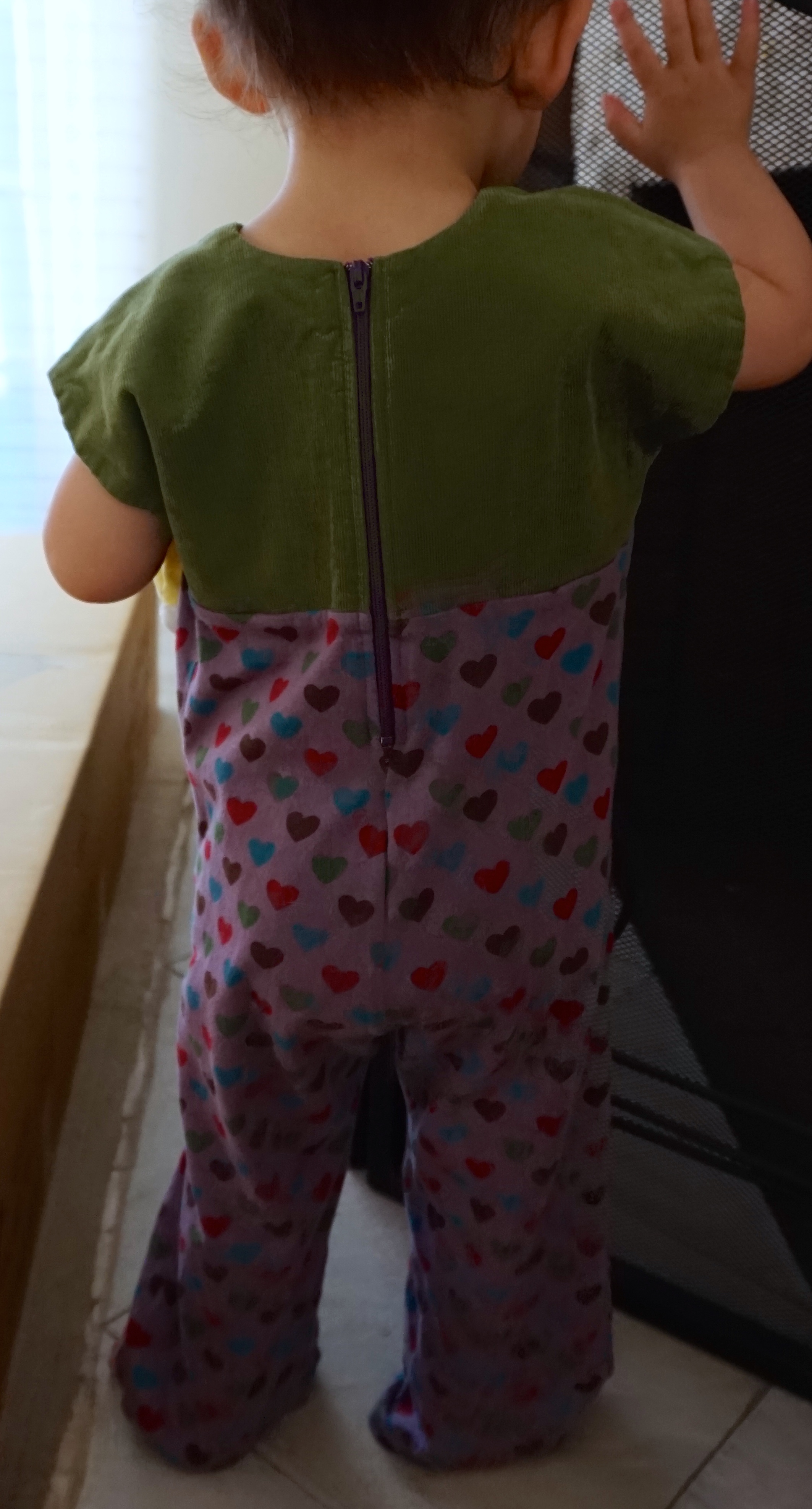 My camera was having an issue with the green corduroy; it looks very strange in the photos. Anyway, I love that exposed zipper. It’s easy to take on and off, but still, I’m the only one she wears these with because no one else wants to completely undress her for diaper changes.