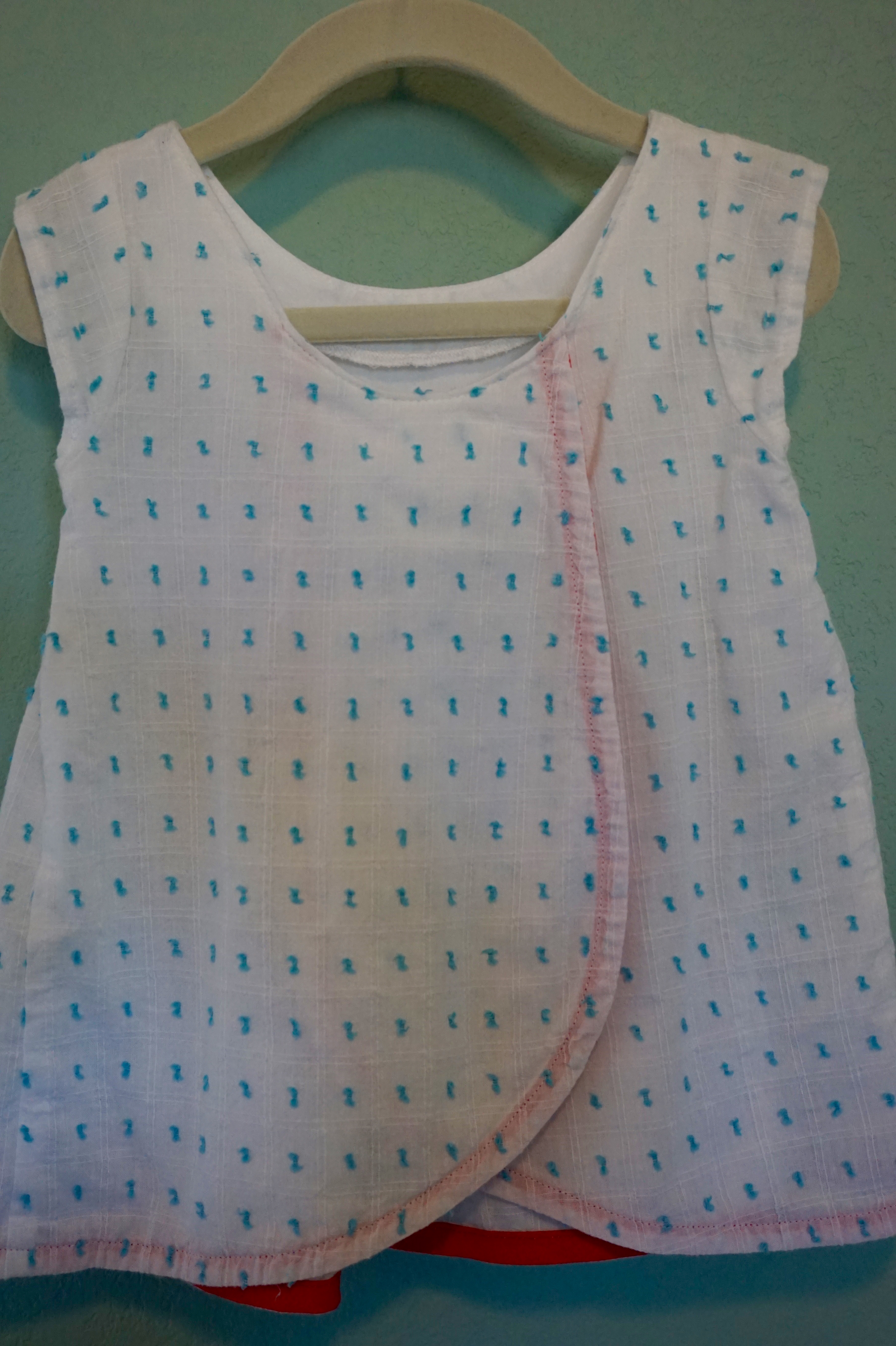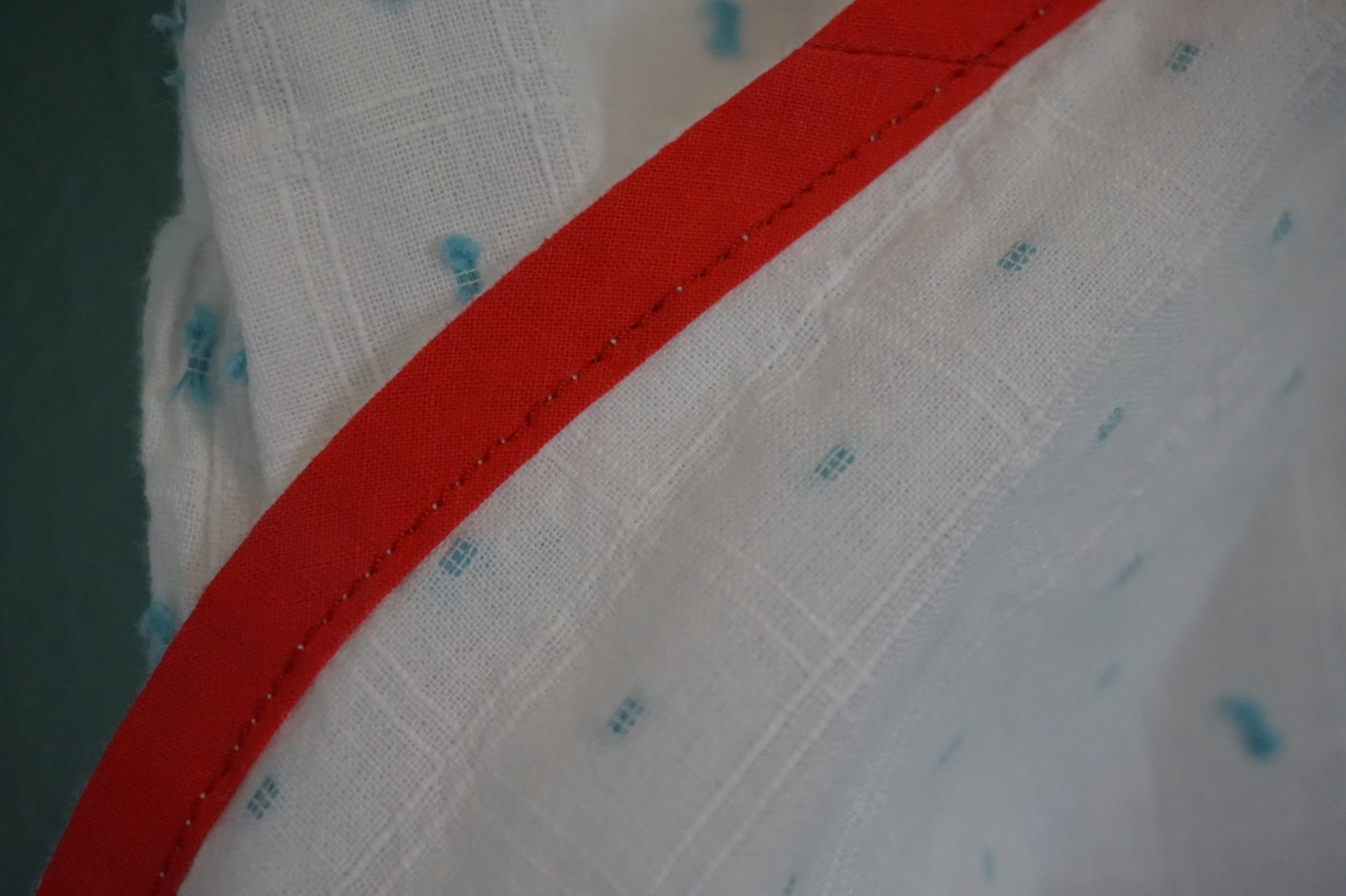 I used a bright coral/red bias tape to finish the hem. I’m thinking I should’ve used it as a trim instead of turning it all the way under since it’s so visible from the outside. Oh well, it still looks cute and adds a pop of color.