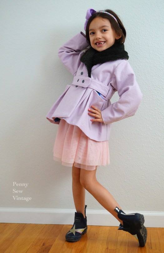 I made view C with view B’s belt. I just love the fanciful pleats and oversized collar in view C with the simplicity of B’s belt. Her measurements are: chest 21.25″, waist 20.5″, hips 23.25″, and height 46.5″. I made size 3 with a size 6 height, and she’s 7 years old; definitely go by the pattern’s measurements. In regards to altering the pattern for size adjustments, there are very detailed instructions to make it as straightforward as possible. Typically I would’ve used a size 4 chest if I had to adjust all the way to a 6 for height to make it simple on myself, but the pattern mentions that it’s a dropped armscye to create a “blanket wrapped around them” feel, so I decided to go with the size 3 chest and not worry about adjusting the armscye, plus I felt like with an oversized coat like this, sizing up at the chest may have swallowed her tiny self.