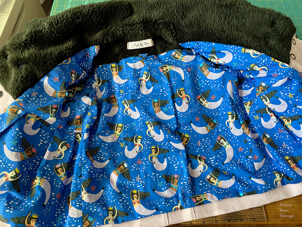 After debating I finally settled on some lavender Carhartt canvas I picked up from Cali Fabrics for my main (they’re out of lavender but still have it in black), polartec fleece I found at Fashion Fabrics for the collar, and a mermaid quilting cotton fabric (she adores manatees and their folklore) from Robert Kaufmann. I was a bit nervous about the Carhartt canvas as it has a “sturdy 12oz weight”, but like Cali Fabrics described it, it does have a “softer hand and more flexibility” than other canvases of its weight. I used a 90/14 universal needle with this canvas and fleece as well, and fortunately didn’t have any real issues with those thicker seams, much to my relief.