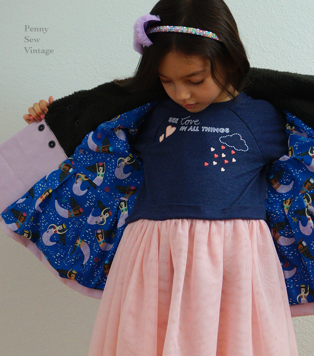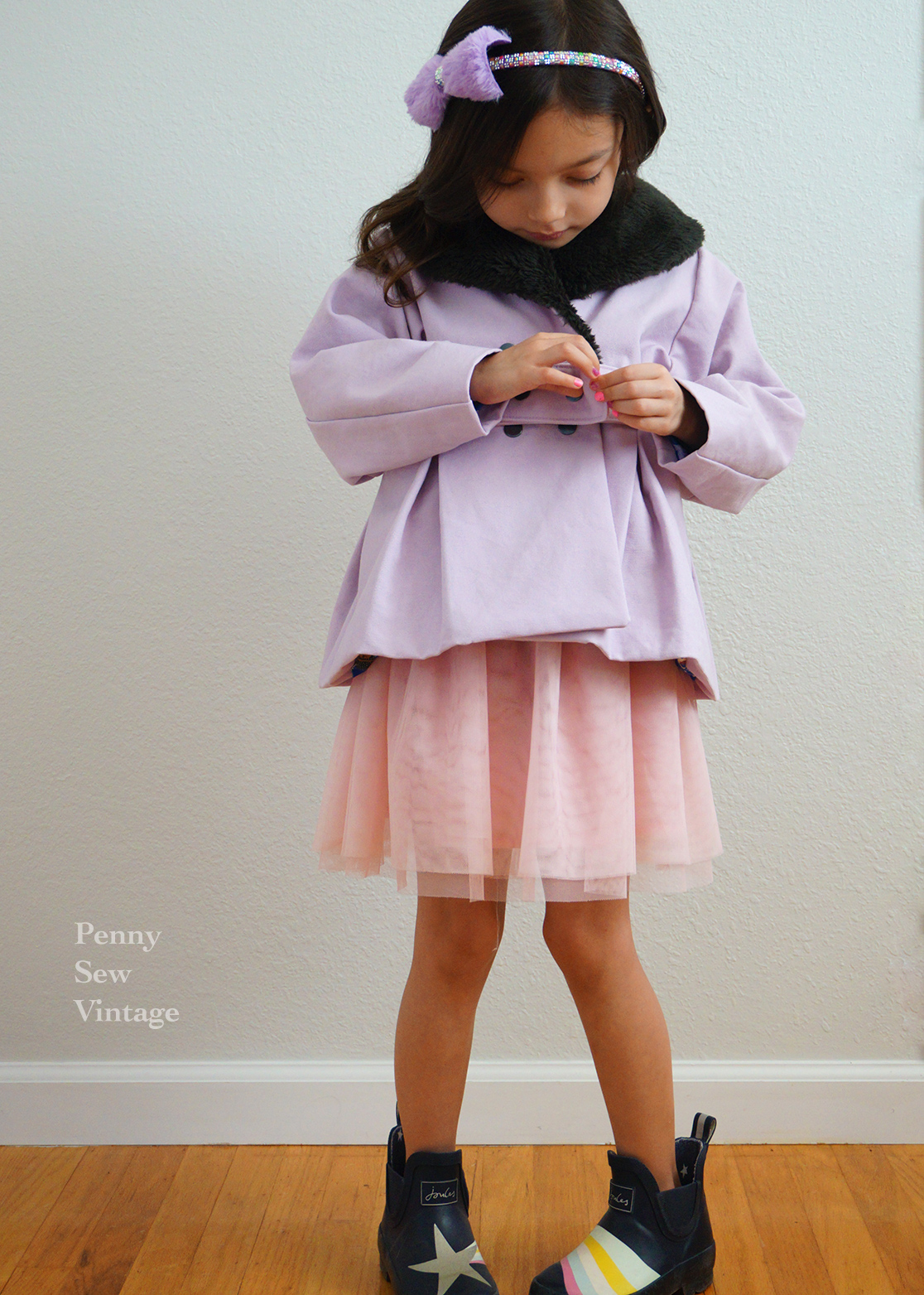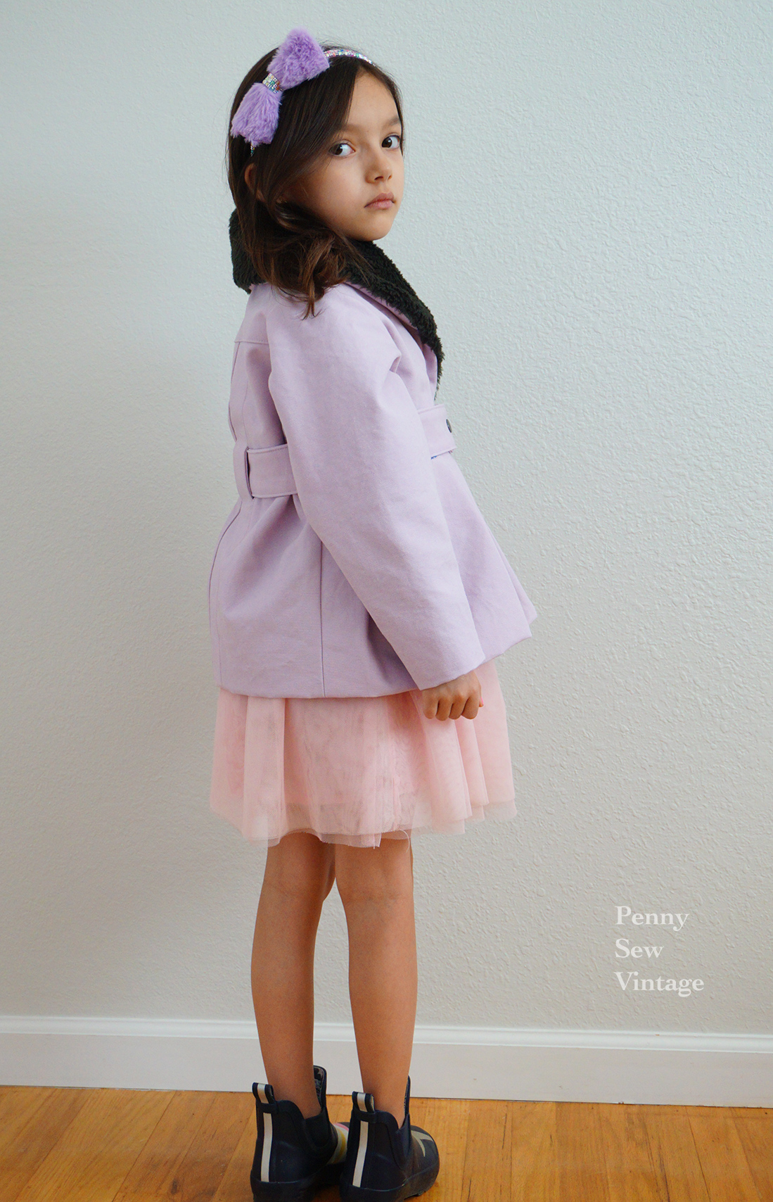 I made view C with view B’s belt. I just love the fanciful pleats and oversized collar in view C with the simplicity of B’s belt. Her measurements are: chest 21.25″, waist 20.5″, hips 23.25″, and height 46.5″. I made size 3 with a size 6 height, and she’s 7 years old; definitely go by the pattern’s measurements. In regards to altering the pattern for size adjustments, there are very detailed instructions to make it as straightforward as possible. Typically I would’ve used a size 4 chest if I had to adjust all the way to a 6 for height to make it simple on myself, but the pattern mentions that it’s a dropped armscye to create a “blanket wrapped around them” feel, so I decided to go with the size 3 chest and not worry about adjusting the armscye, plus I felt like with an oversized coat like this, sizing up at the chest may have swallowed her tiny self.